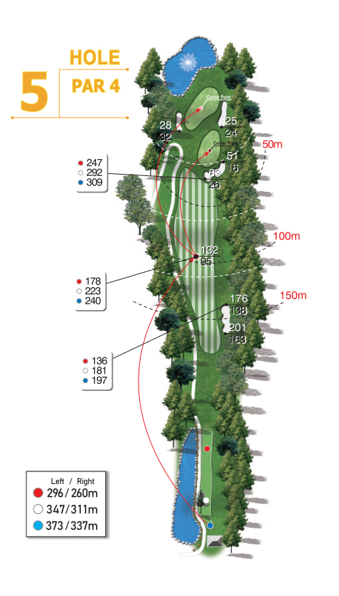 - 완만한 오르막 S자형 파4홀로 우측으로 가드벙커가 있지만 슬라이스에 조심하지 않으면 OB지역으로 낭패를 볼 수 있다. 티샷은 멀리 보이는 좌측 라이트 방향이 이상적이며 그린공략은 앞 그린 벙커와 그린 넘어 해저드에도 유의해야 한다.